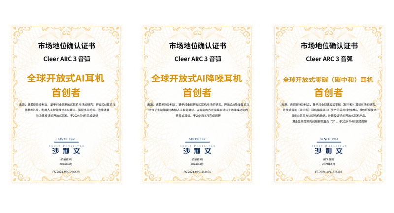 Cleer ARC 3 音弧的技術(shù)創(chuàng )新與環(huán)保理念也通過(guò)了國際權威機構沙利文的認證,獲得了“全球開(kāi)放式AI降噪耳機首創(chuàng )者”、“全球開(kāi)放式零碳(碳中和)耳機首創(chuàng )者”、“全球開(kāi)放式AI耳機首創(chuàng )者”等多項榮譽(yù)證書(shū)。這些認證不僅是對Cleer產(chǎn)品創(chuàng )新的高度肯定,也進(jìn)一步奠定了Cleer在國際聲學(xué)領(lǐng)域的領(lǐng)先地位。